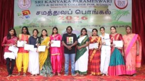 విళ్లివాకం న్యూస్: చెన్నై, శ్రీ కన్యకా పరమేశ్వరి కళ మరియు విజ్ఞాన మహిళా కళాశాలలో సమత్తువ పొంగల్ వేడుకలను గొప్ప ఉత్సాహంతో, సాంస్కృతిక శోభతో జరుపుకున్నారు. సాంస్కృతిక సామరస్యాన్ని పెంపొందించే లక్ష్యంతో ఈ వేడుకలు నిర్వహించబడ్డాయి. విస్తృత శ్రేణి సాంస్కృతిక కార్యక్రమాలు మరియు సాంప్రదాయ కార్యకలాపాల ద్వారా తమిళ వారసత్వం యొక్క గొప్పతనాన్ని ప్రదర్శించింది. ప్రకృతి, రైతులు మరియు సూర్య భగవానుడికి కృతజ్ఞతలు తెలిపే పొంగల్ తయారీ వేడుక ఈ కార్యక్రమంలో ముఖ్యాంశం. ఈ కార్యక్రమంలో కరగాట్టం, కోలాట్టం, మైలాట్టం, కావడియాట్టం, సిలంబాట్టం వంటి సాంప్రదాయ జానపద నృత్యాలతో కూడిన ఉత్సాహభరితమైన నృత్య పోటీలు కూడా జరిగాయి.